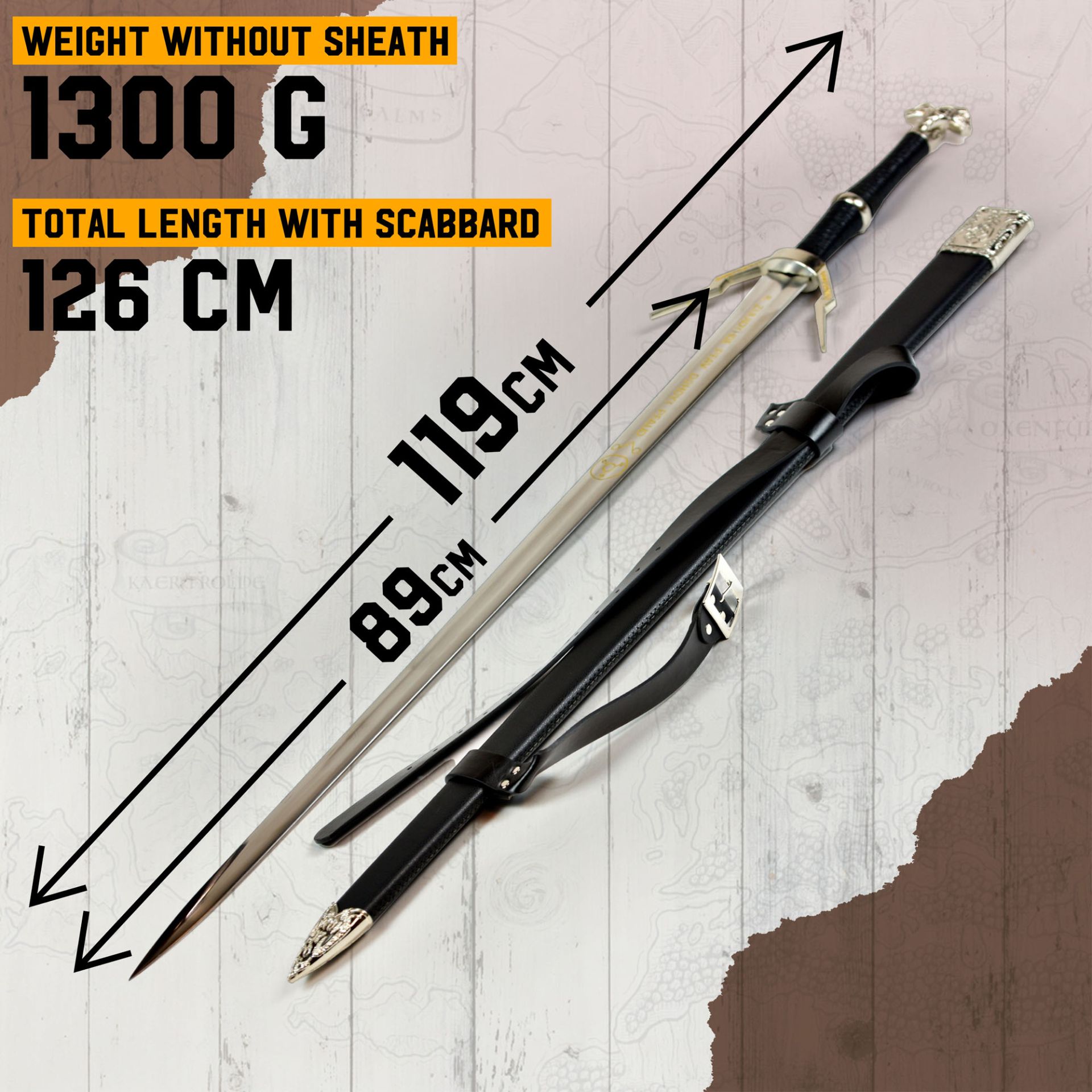 Cool och välgjord replika inspirerad av Witcher serien. Mycket välgjord replika och inredningspryl för display till samlingen hemma eller för lajv och cosplay event. Svärdet är ca 126 cm långt och kommer med träslida med ytskickt i syntetiskt läder. Gjord i 420 rostfritt stål. Ett måste för Wither fans, passar bra i spel- eller -biorummet. Ej licensierad produkt!